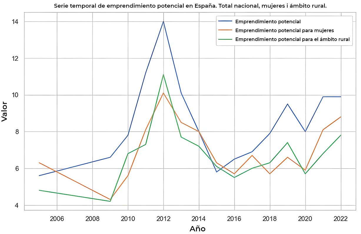 La tasa de actividad emprendedora reciente (TEA) en Cataluña es del 7,3% por los hombres y del 6,5% para las mujeres, mientras que el emprendimiento potencial es del 10,4% por los hombres y del 9,4% para las mujeres. En el ámbito rural, el 7,1% de la TEA se encuentra en comparación con el 6,9% en el ámbito urbano. Dentro del ámbito rural catalán, el 7,4% de los hombres y el 6,8% de las mujeres están involucrados en actividades emprendedoras recientes.